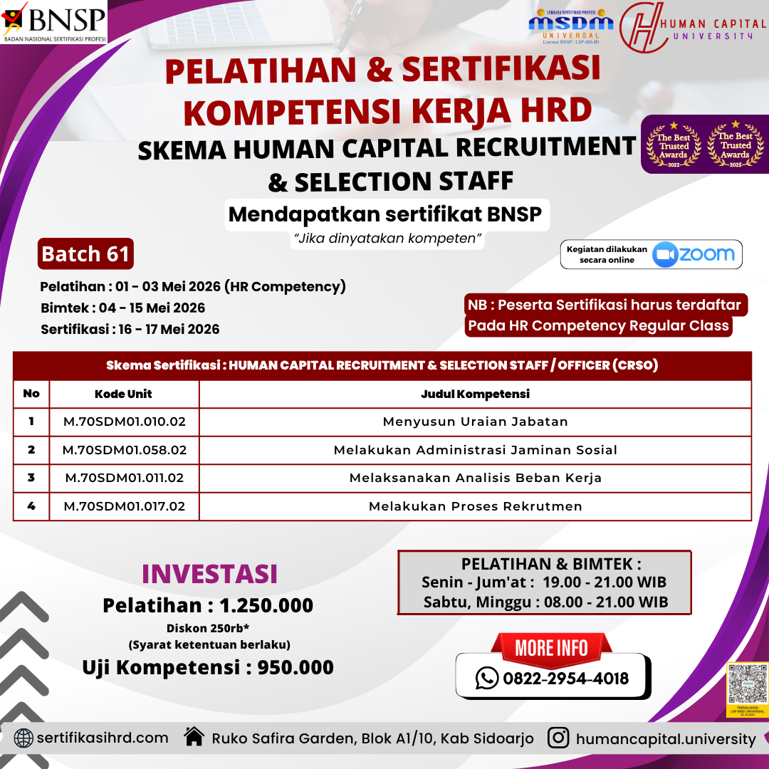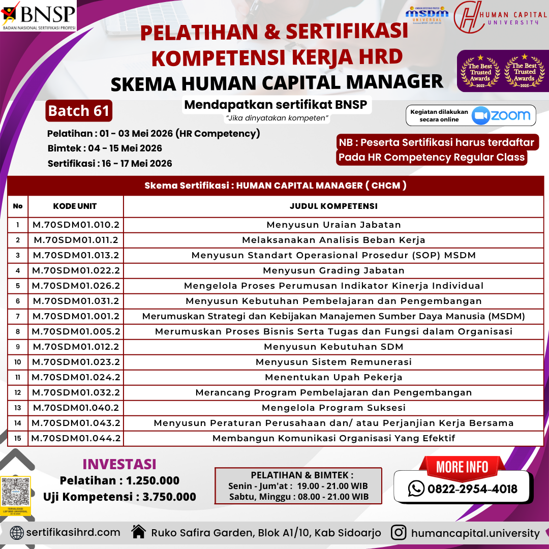 Apapun kebutuhan pengembangan SDM Anda, kami siap menjadi mitra terbaik Anda. Skema Sertifikasi Kompetensi HR (Mendapatkan Sertifikat Kompetensi dari BNSP Jika dinyatakan kompeten)
