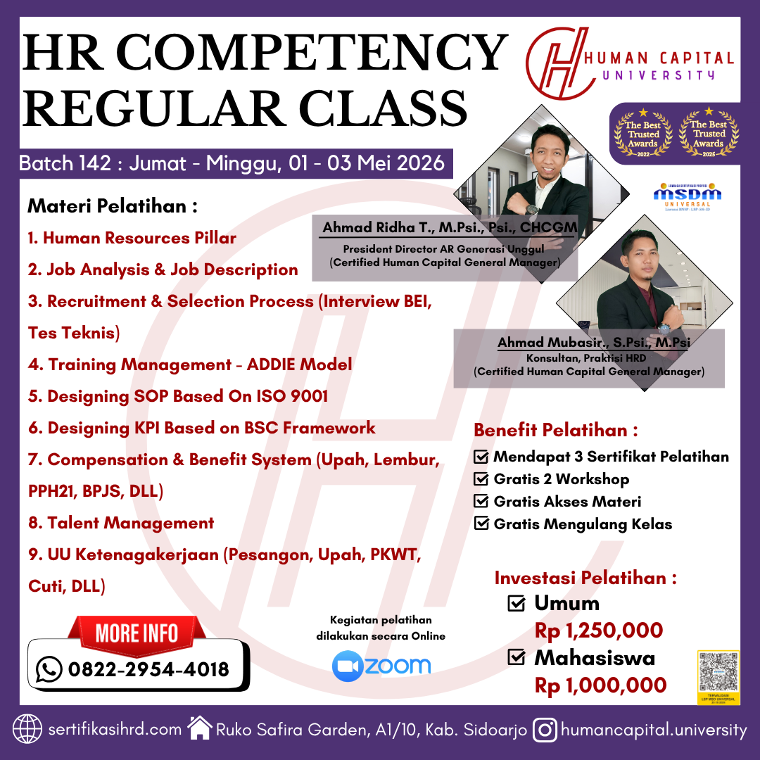 Human Capital University merupakan salah satu perusahaan yang bergerak dalam Jasa Training Terapan, Sertifikasi Kompetensi Kerja bidang Human Resources (HR), Industrial Relation (IR), dan Training Of Trainer (ToT) yang berdomisili di Sidoarjo, Jawa Timur Indonesia. Kami terdaftar sebagai TUK di LSP MSDM UNIVERSAL (Lisensi BNSP : LSP-516-ID). Trainer dan mentor kami terdiri dari para praktisi yang didukung dengan akademisi yang baik. Juga memiliki berbagai latar belakang kompetensi praktis di lapangan dan mampu berkolaborasi untuk memberikan solusi serta bimbingan.
