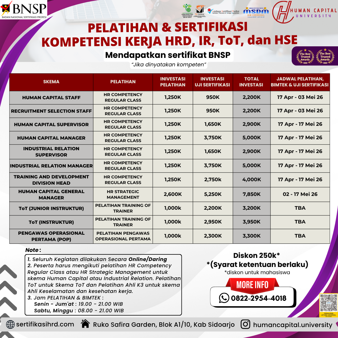 3.100+ Alumni telah ikuti Pelatihan dan Sertifikasi Kompetensi HR, IR, ToT, dan HSE di Human Capital University